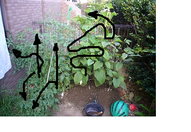 黒の矢印はミニトマト2株とキュウリの生えている方向をしめしています。