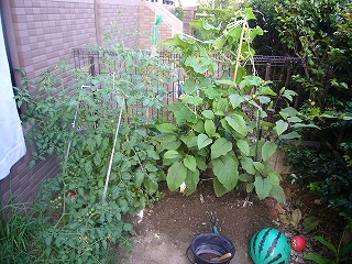 キュウリは順調にとれているが、中途半端な高さの支柱を追い越してしまいどこに伸びていけばいいのか迷走中、、、。