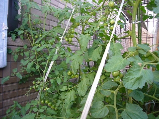 ミニトマトは1本立ちのつもりだったのに、根元からいきなり真横に伸びている。なんかもったいない気がしたので、支柱のてっぺんからビニール紐で吊り下げるように支えている。