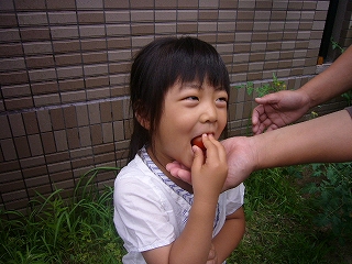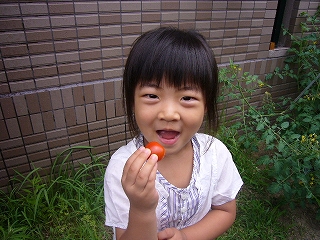 ミニトマトは前歯でかんだら汁がとぶよ、気をつけな。